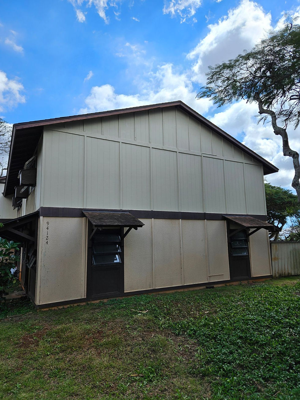 Our team repaired a damaged soffit on the corner of the Kaneohe Shopping Center. Years of weather exposure caused rust and deterioration, leaving the framing exposed. We removed the damaged areas, reinforced the structure, and installed durable new soffit panels. The result is a clean, long-lasting finish that restores both safety and appearance.